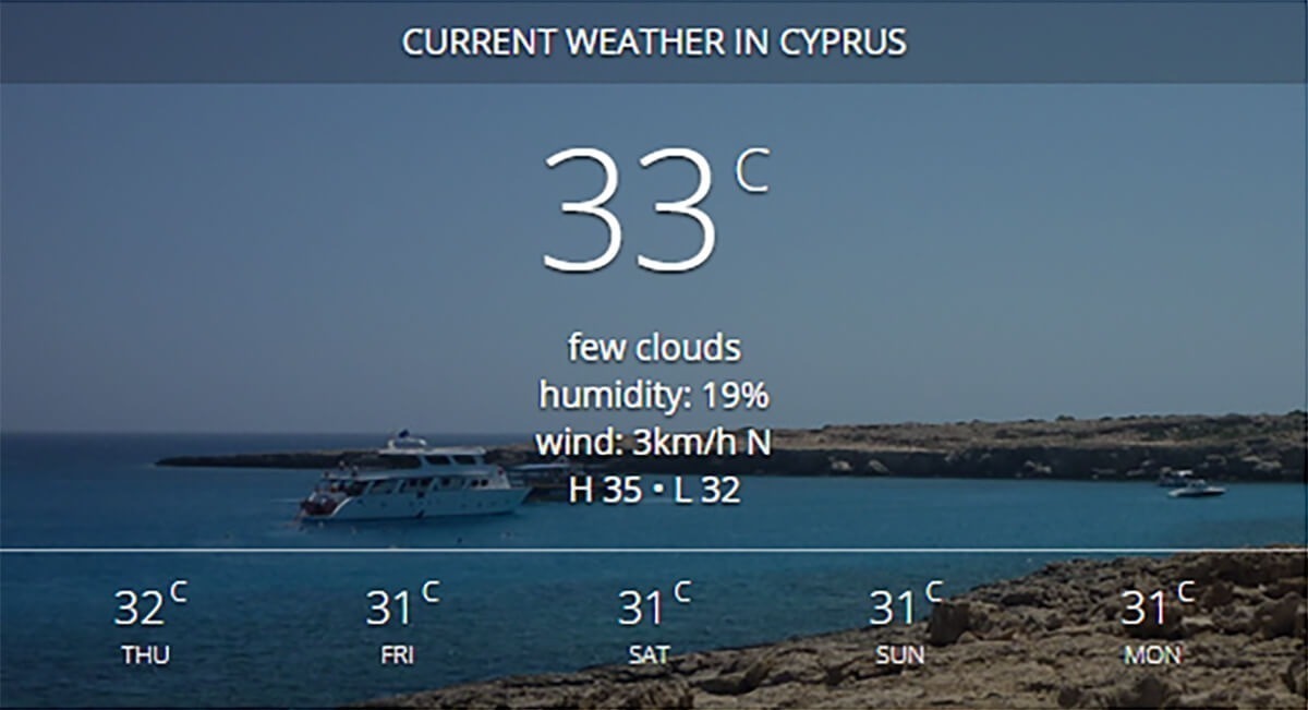 Cyprus enjoys an intense Mediterranean climate, with long dry summers from mid–May to mid–October, and mild winters from December to February, which are separated by short autumn and spring seasons. Summer is a season of high temperatures with cloudless skies, but the sea breeze creates a pleasant atmosphere in the coastal areas. Isolated thunder showers are possible mainly over the mountains during early afternoons. Winters are mild with rain and snow on Troodos Mountains (usually starting before Christmas).The island enjoys abundant sunshine, and even in December and January, there is an average of six hours of bright sunshine per day, whilst over the six ‘summer’ months, there is an average of 11.5 hours of bright sunshine per day.